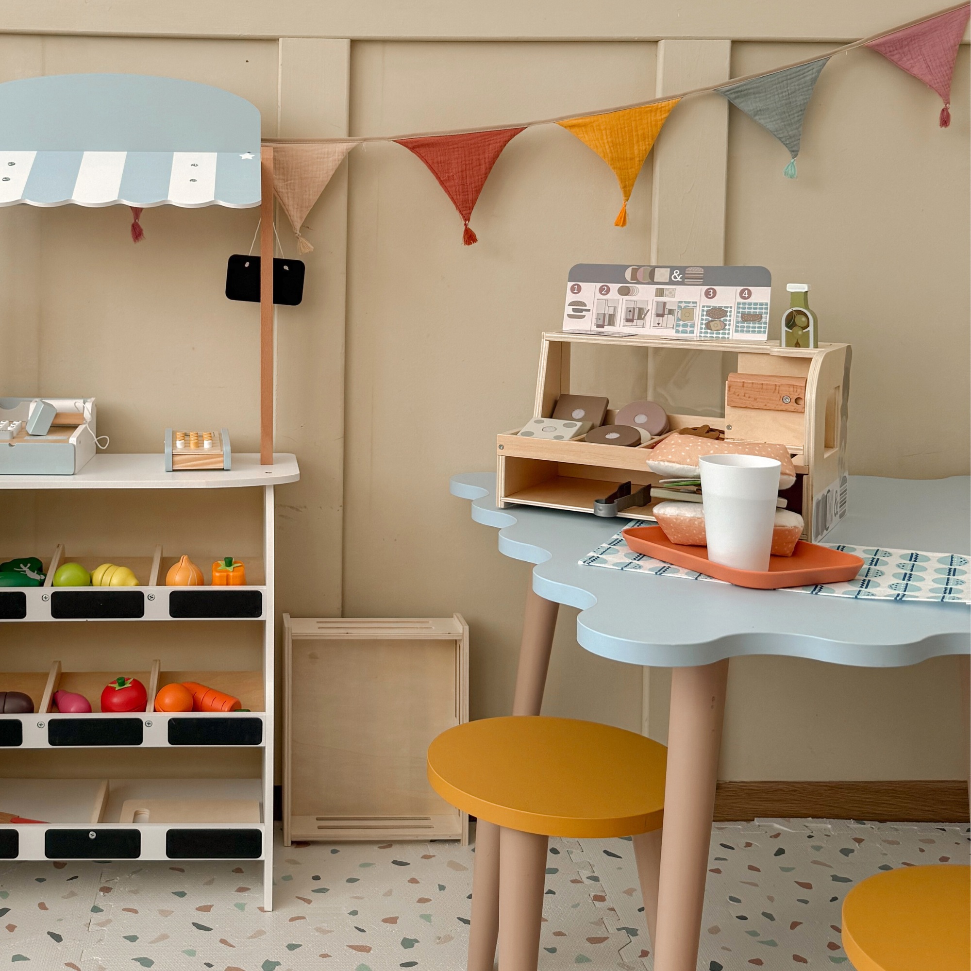 Gracias al juguete equipado con numerosos accesorios, su hijo podrá desempeñar el papel de vendedor de bocadillos frescos y coloridos. La sandwichera, fabricada en madera resistente, contiene todo lo necesario para prepararlos. La verdadera atracción es el cortador móvil , que permite al niño "cortar" queso o carne. Los ingredientes del sándwich tienen velcro , para que puedas componer fácilmente un sabroso sándwich. ¡Ahora todo lo que necesitas es una bebida y una deliciosa comida estará lista!