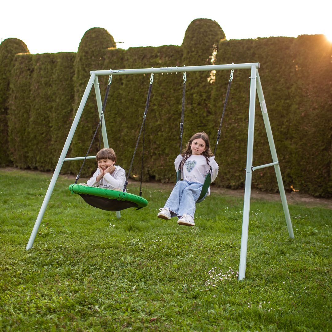Llamando la atención por su diseño moderno, el columpio hará que el jardín sea aún más atractivo para los niños. Gracias a la posibilidad de instalar tanto un nido de cigüeña como un cómodo asiento , los niños podrán balancearse al mismo tiempo y participar en la diversión conjunta. El columpio tiene una estructura extremadamente estable y duradera , por lo que no tienes que preocuparte por la seguridad de tus hijos mientras se balancea.