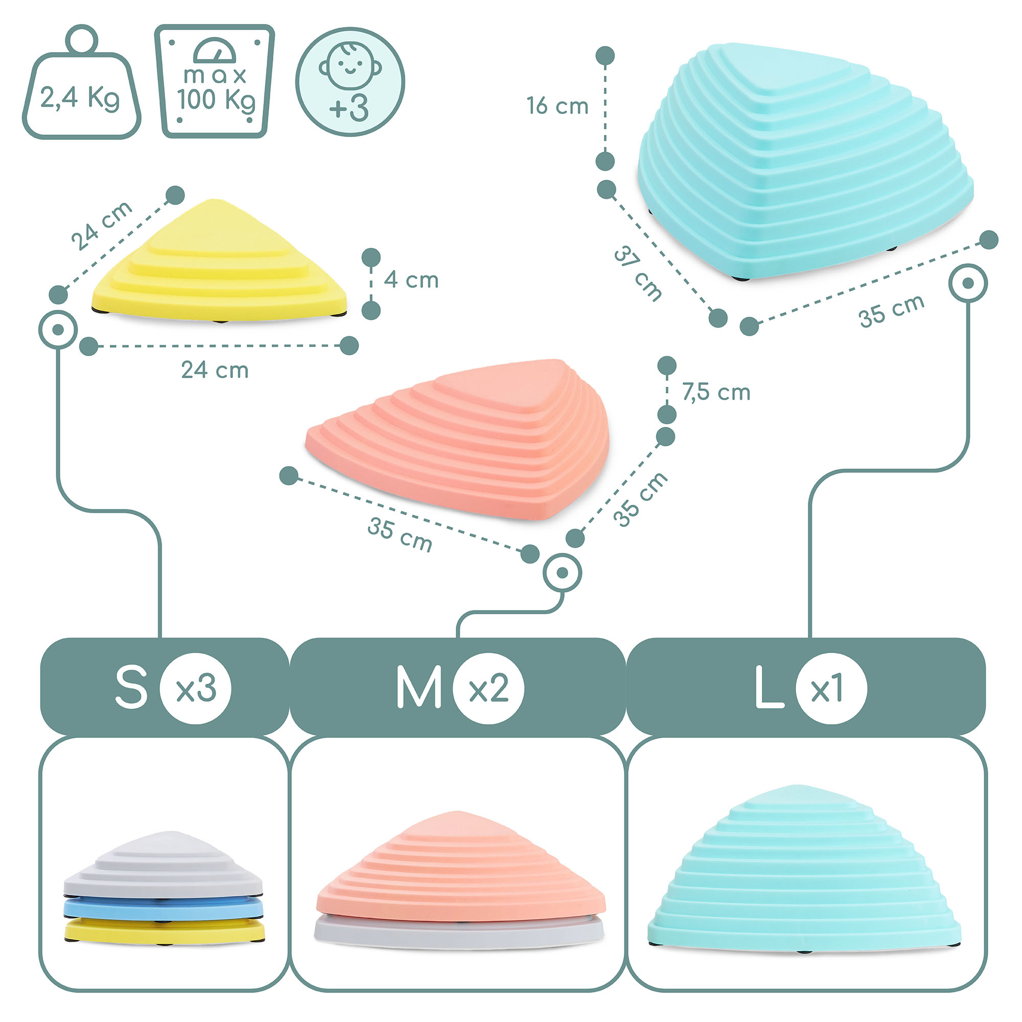 El juego de piedras de equilibrio contiene 6 piezas de distintos tamaños y colores. Simplemente colóquelas a cierta distancia unas de otras para proporcionar a su hijo pequeño un atractivo entretenimiento. Balancearse sobre una sucesión de piedras es un excelente ejercicio para el equilibrio y ejercita la coordinación motora. El juego es una excelente elección no sólo para el hogar, sino también para la guardería o la sala de rehabilitación.
