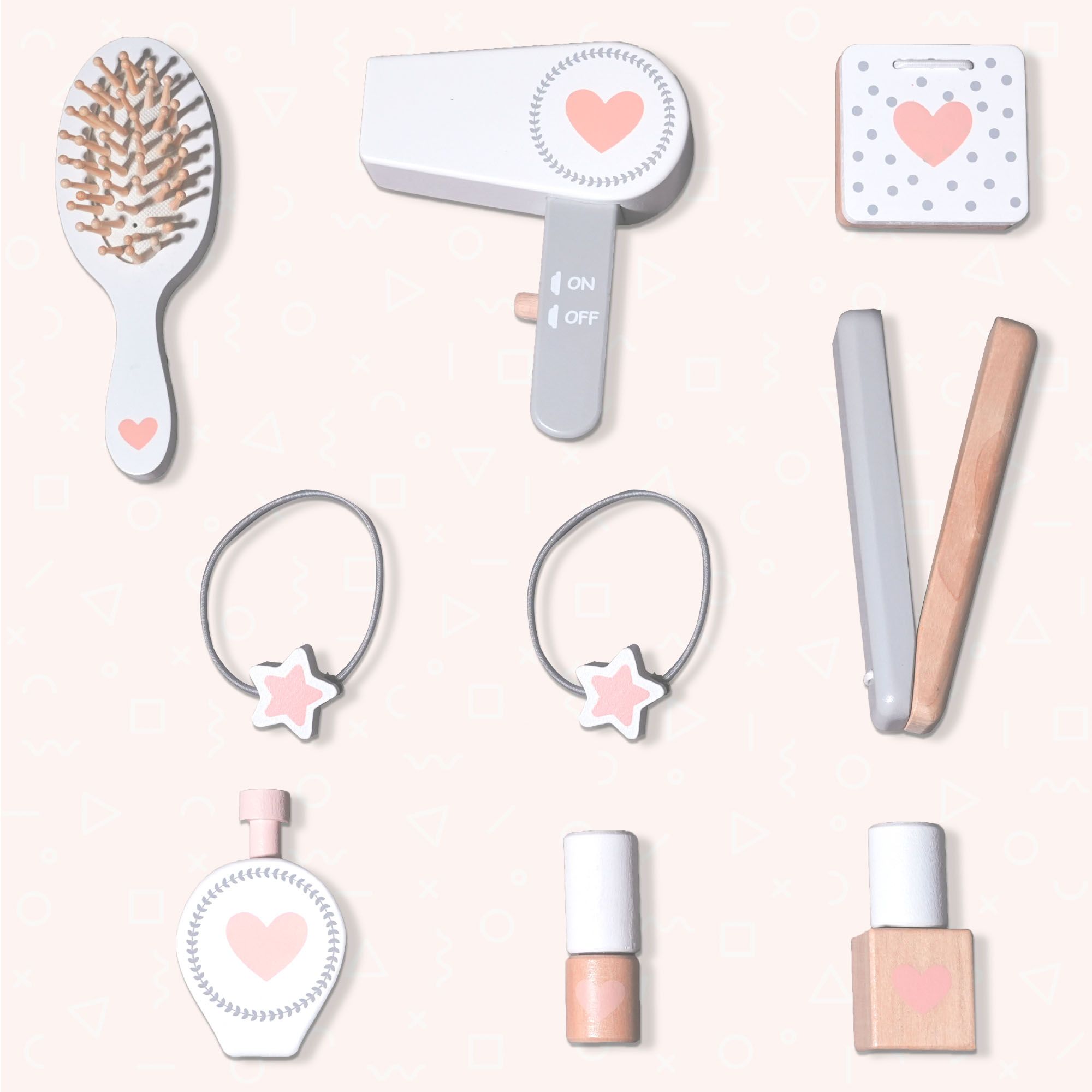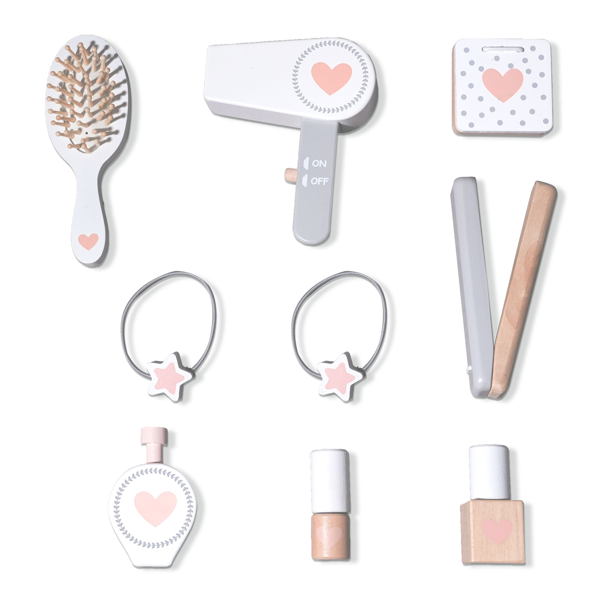 • Hasta 9 accesorios incluidos: cepillo de pelo, secador de pelo, sombra de ojos, 2 elásticos, plancha de pelo, perfume, laca de uñas, pintalabios