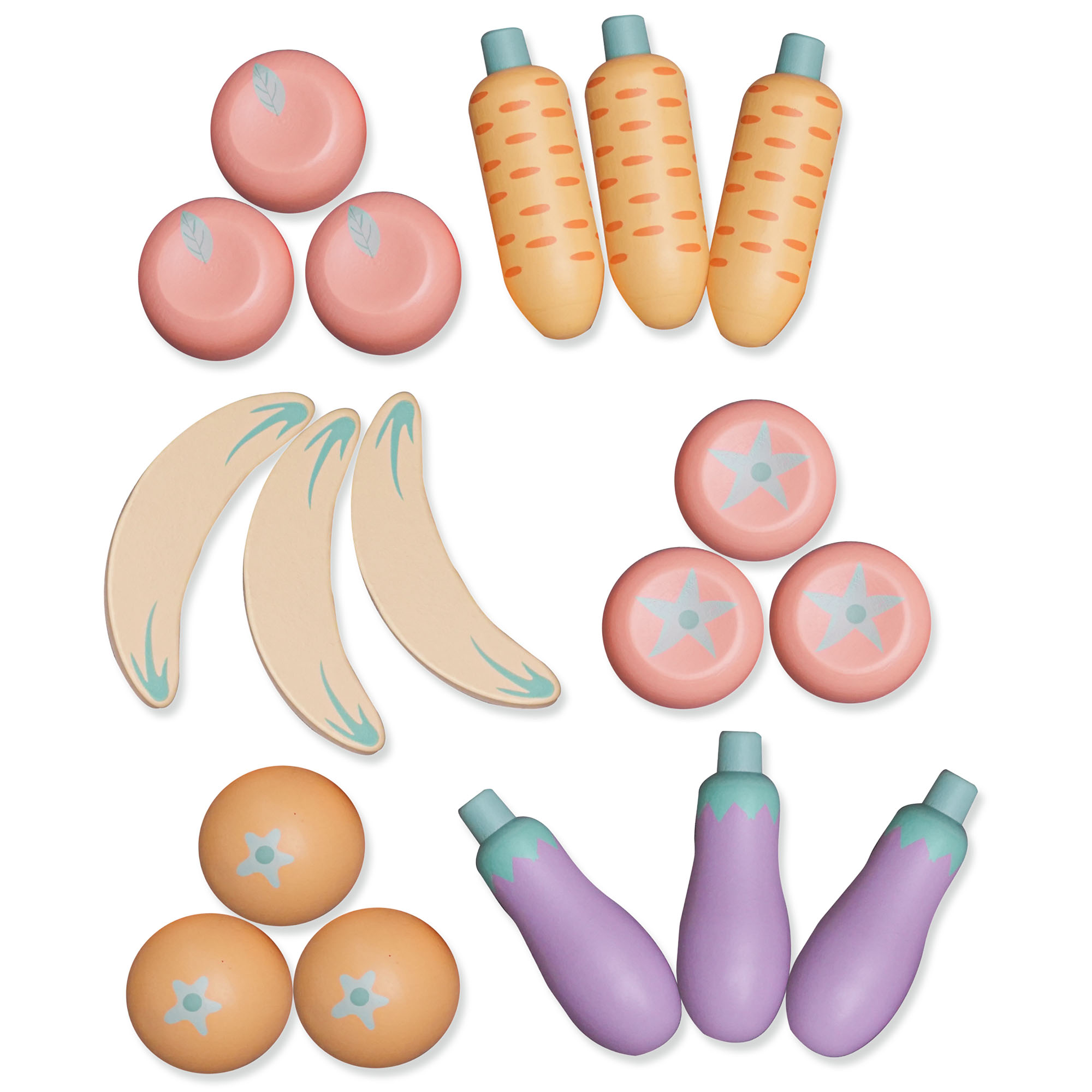 • fruta y verdura (zanahorias, berenjenas, plátanos, naranjas, manzanas, tomates) - 18 uds.