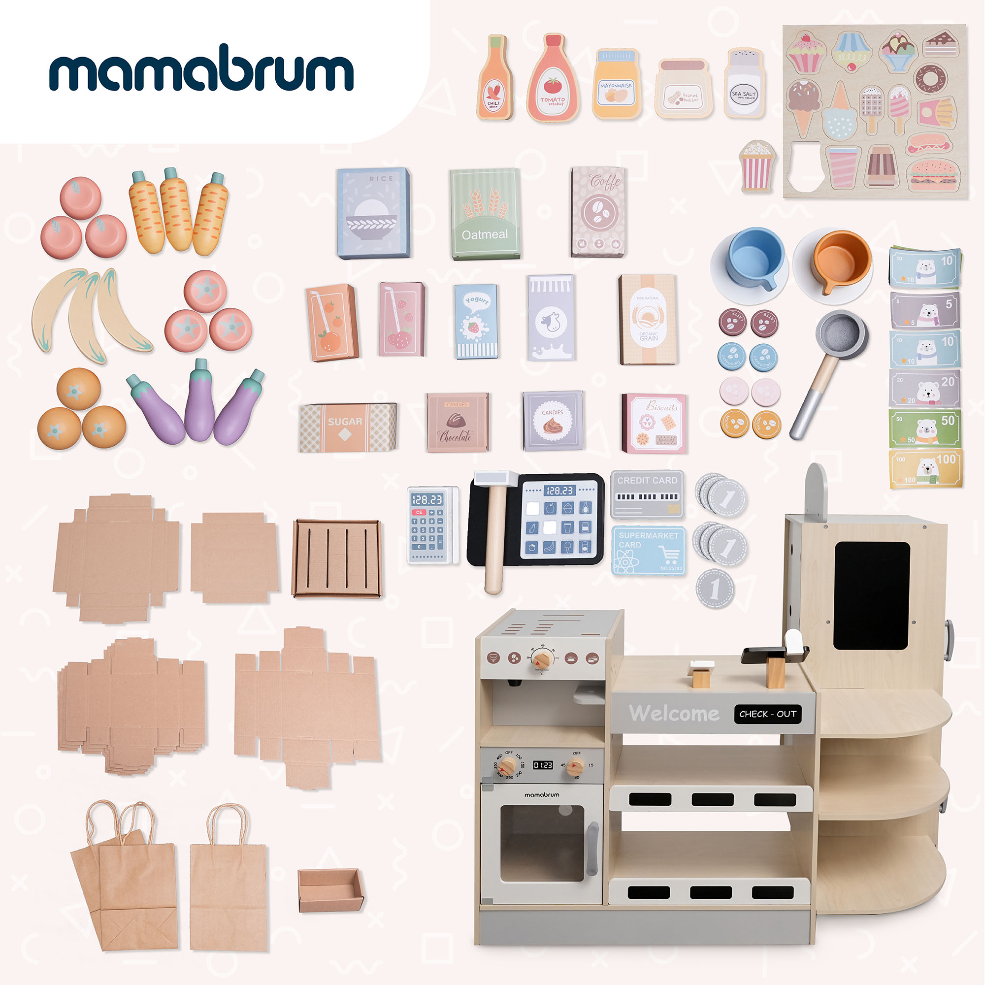 Gran tienda de madera XXXL para niños con barra de comida rápida - Tienda de la esquina + Cafetera + Horno + Nevera - 106 ac.