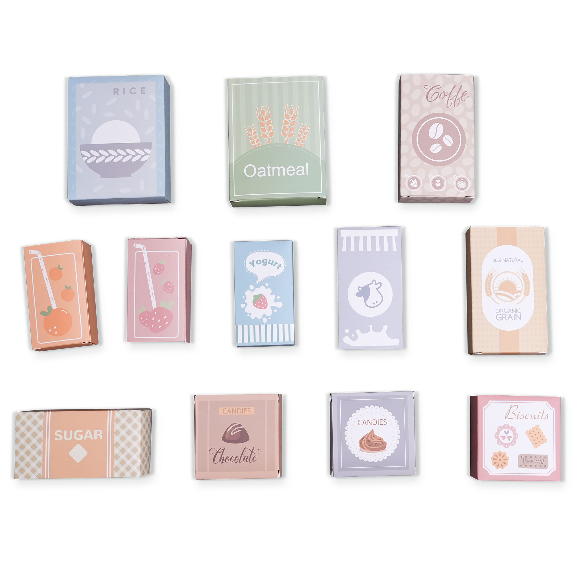 • cajas de productos (leche, yogur, azúcar, café, copos de avena, harina, galletas, dulces, arroz, zumo de naranja, zumo de fresa, ) - 12 uds.