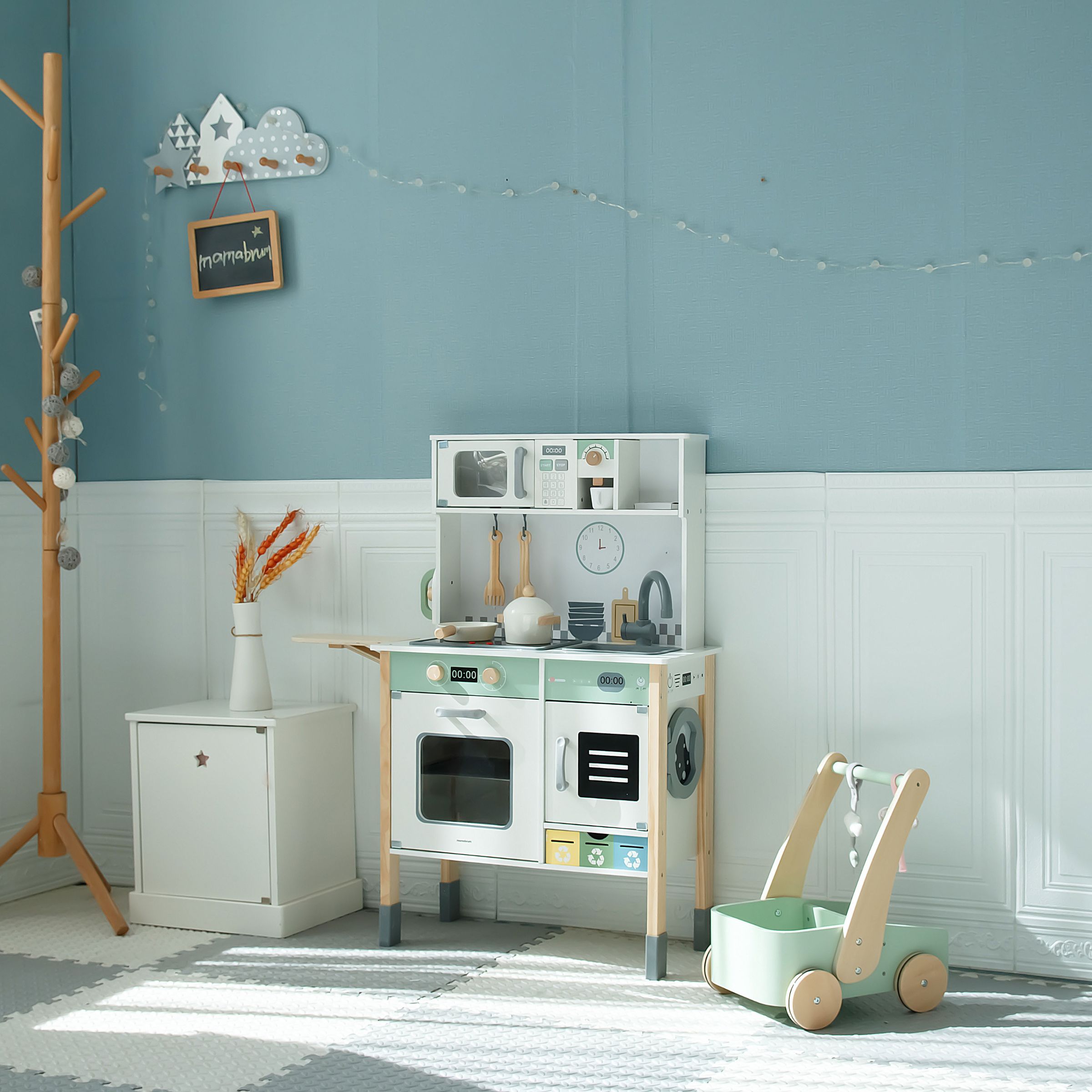 La cocina infantil de madera se ha equipado no sólo con lavavajillas y lavadora, sino también con un cubo de basura con clasificador. En su pared trasera hay una pizarra donde los niños pueden escribir menús o recetas. Una tabla de planchar con plancha, un microondas, un fregadero y una cafetera completan el conjunto. Puede estar seguro de que su pequeño no se aburrirá