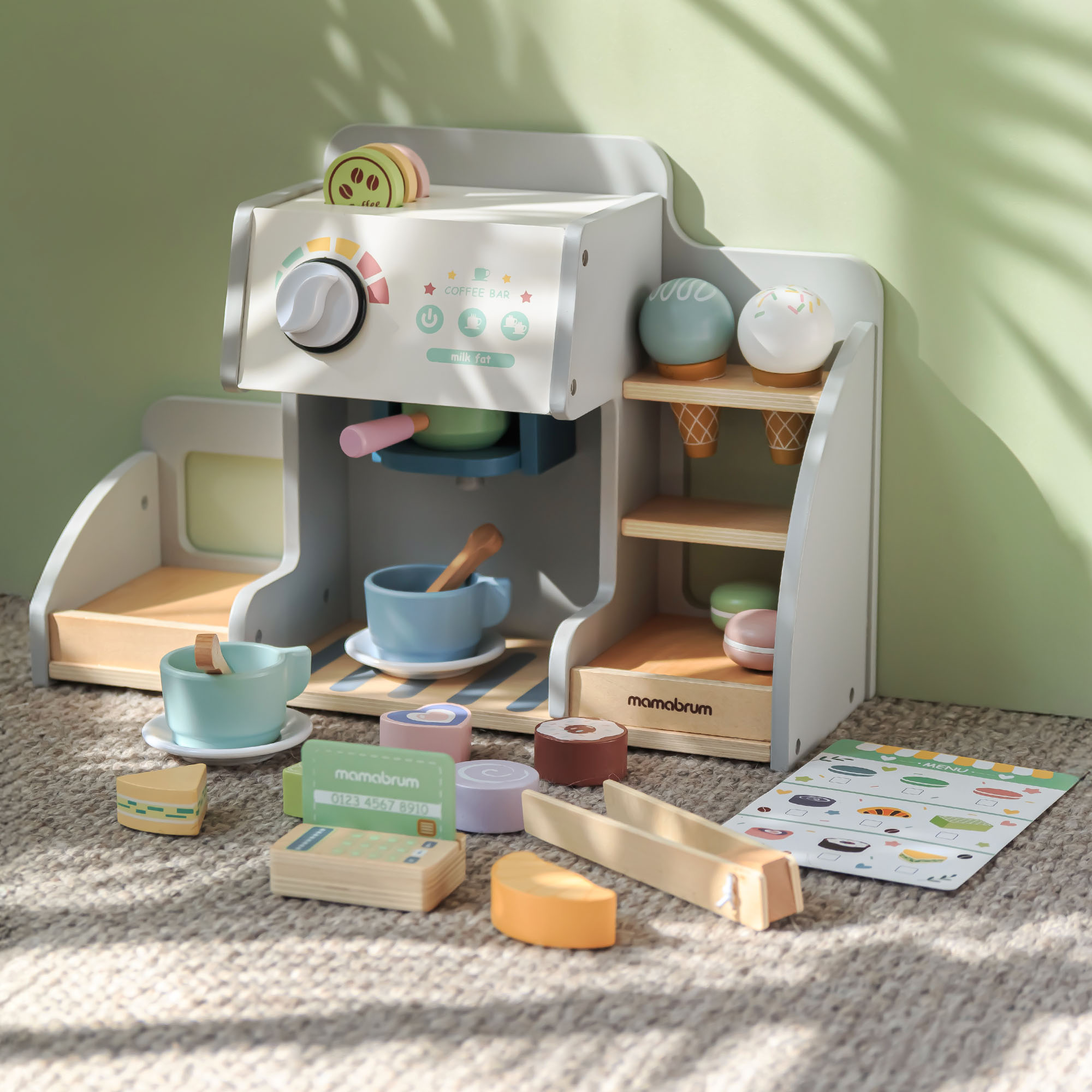 Este bonito set de madera transportará a tu pequeño a un mundo de bebidas aromáticas y dulces Su hijo podrá preparar café, servir helado y cobrar, y luego repetirlo todo en un nuevo escenario de juego. El amplio juego de accesorios le permite crear sus propios menús y divertirse durante horas con sus juegos de rol. Jugar a ser barista desarrolla la creatividad y la destreza de las manitas.