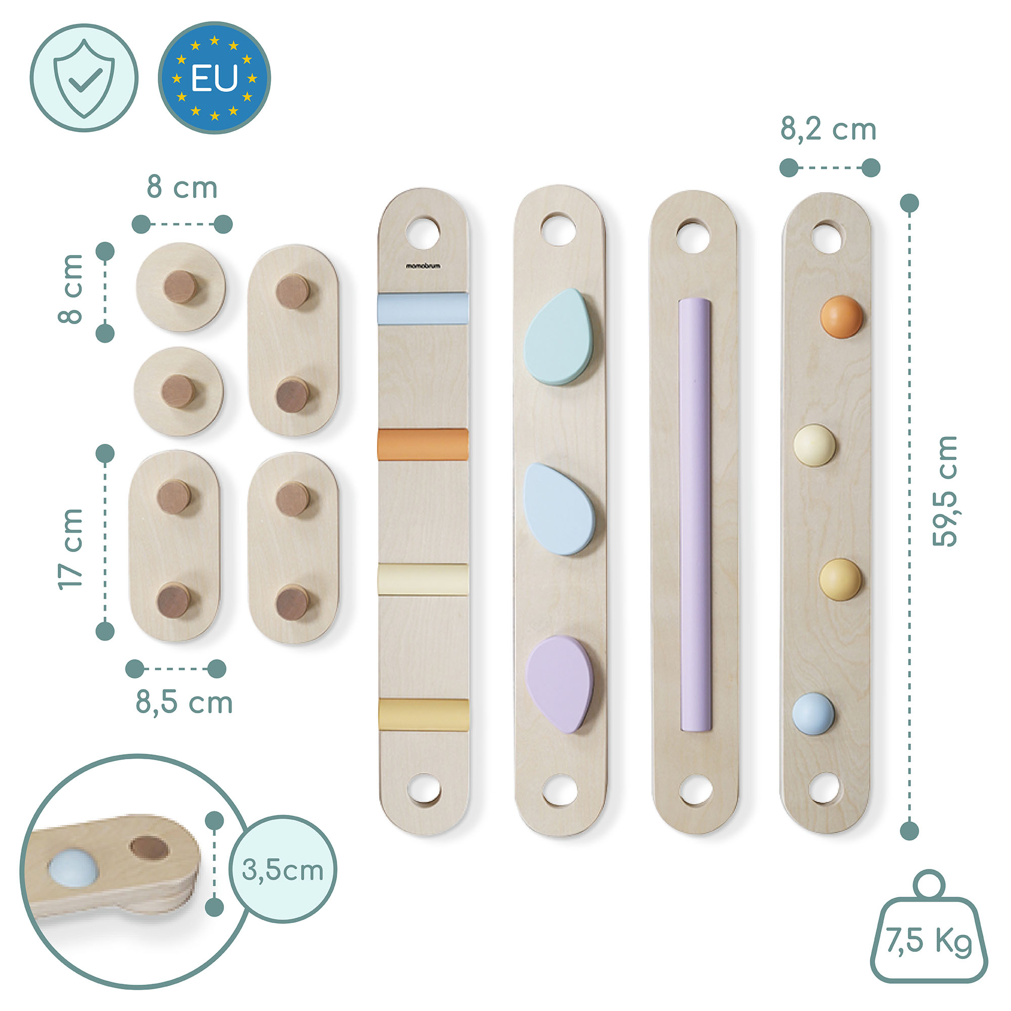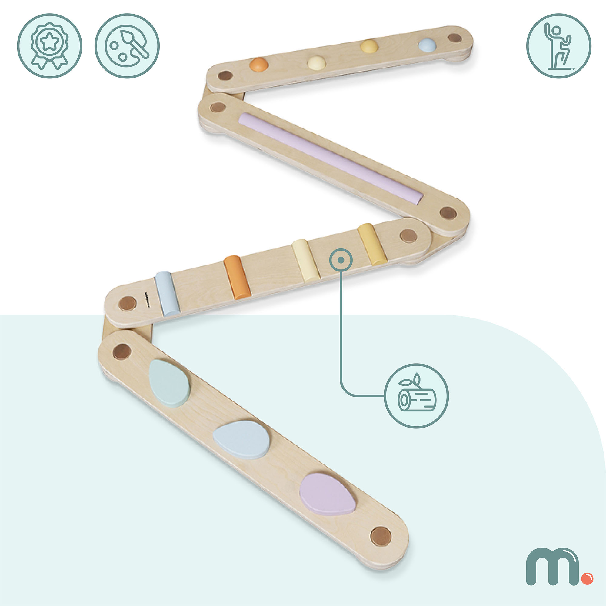 La pista sensorial de madera es un juguete único que convertirá cualquier interior en un espacio lleno de movimiento, diversión y aprendizaje. Gracias a su capacidad para disponerse en diferentes formas -cuadrado, zigzag o camino abierto-, el niño obtiene infinitas formas de jugar mientras desarrolla el equilibrio, la coordinación y la imaginación. Los coloridos elementos sensoriales de formas interesantes estimulan aún más los sentidos y fomentan el juego activo.