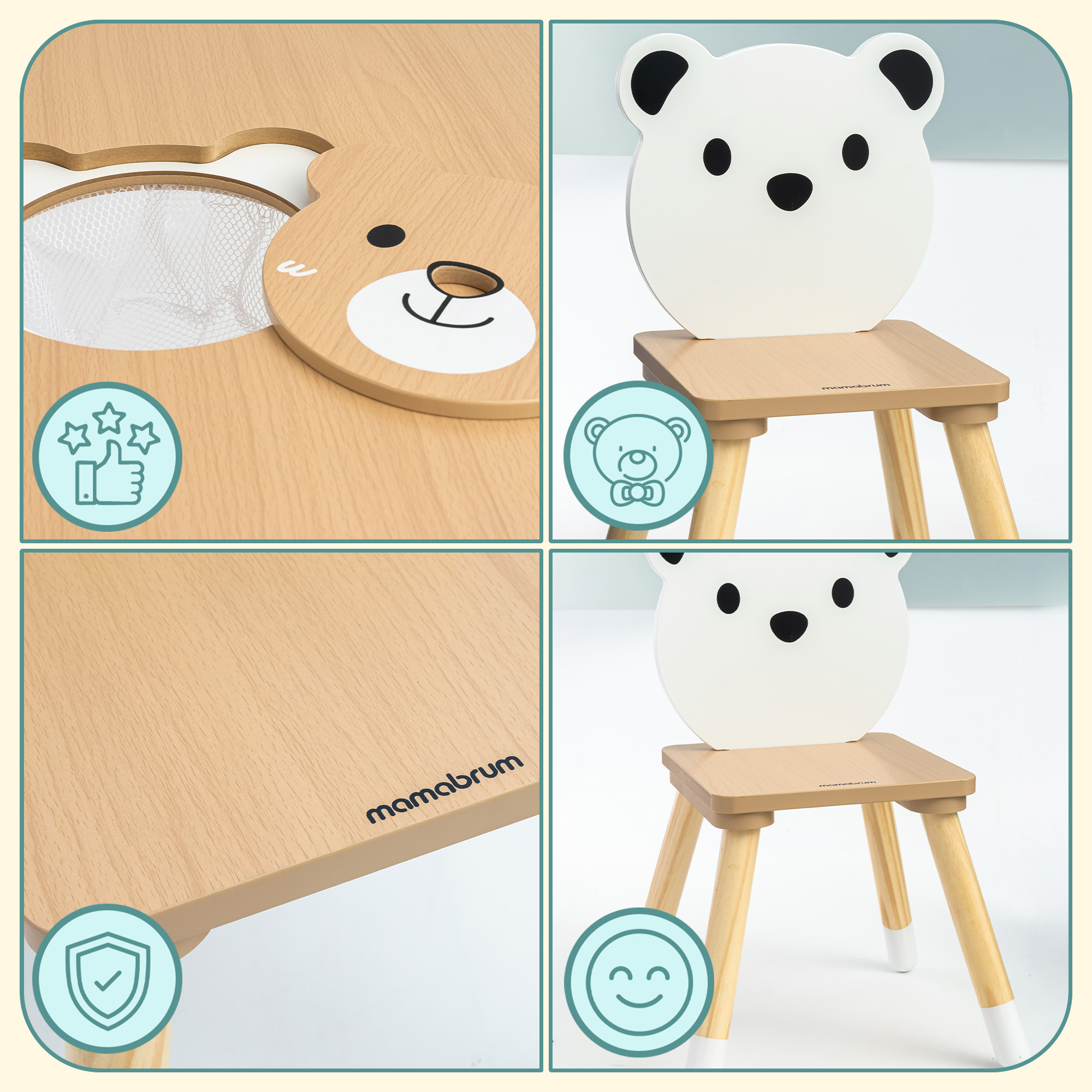 • Un encantador diseño de osito de peluche : los respaldos de las sillas tienen forma de caras de osito de peluche y la mesa tiene una imagen de osito de peluche.