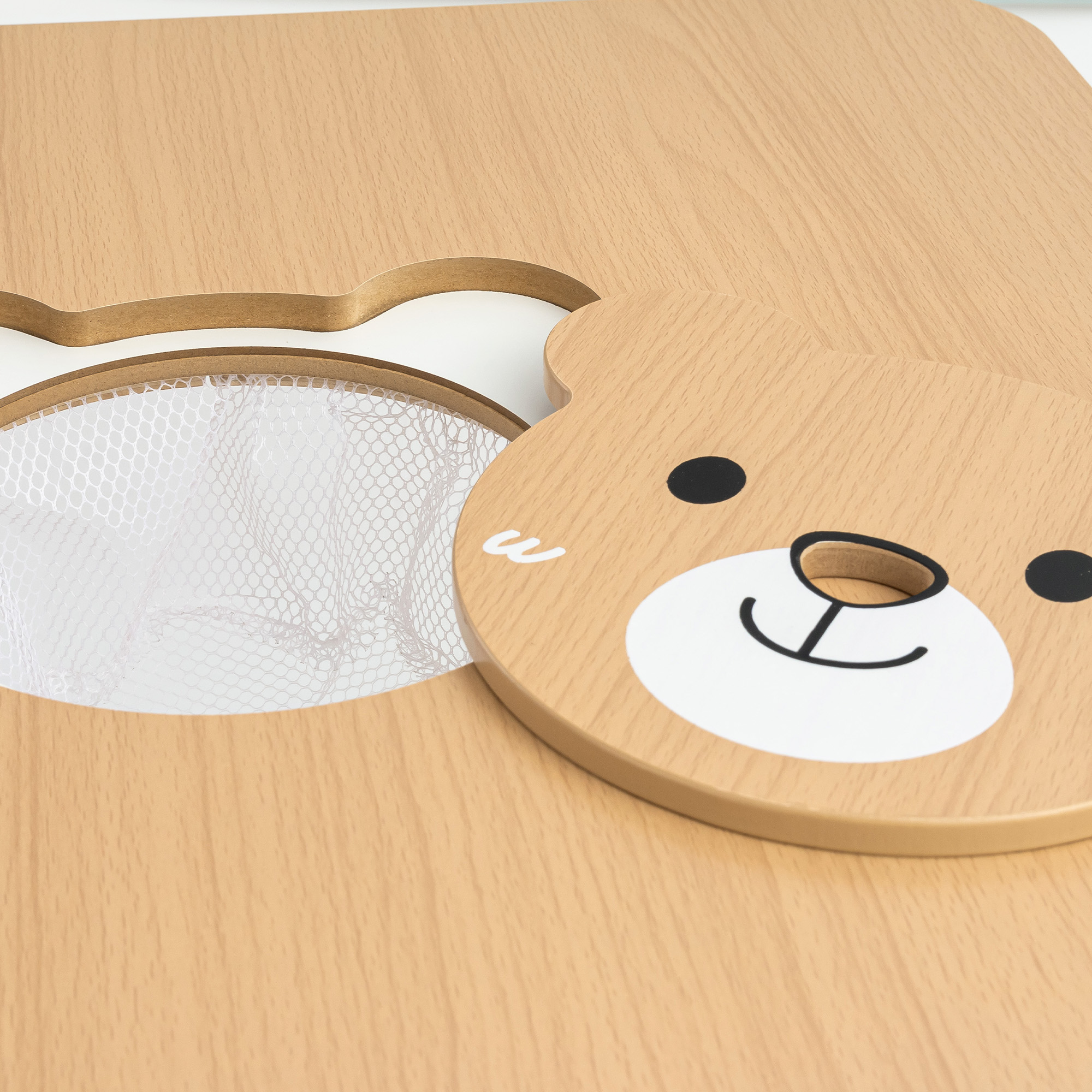 El compartimento central de almacenamiento, hecho de malla flexible, es un verdadero punto fuerte de esta mesa . Oculto ingeniosamente bajo el tablero , permite guardar rápidamente crayones, bloques o juguetes favoritos, manteniendo la mesa ordenada. El compartimento cuenta con una práctica tapa con forma de osito que, al cerrarse, crea una superficie perfectamente lisa . Los niños tienen fácil acceso a todos sus objetos esenciales sin tener que levantarse de la mesa. Esto no solo es práctico, sino también una delicia para los pequeños: cada vez que abren el "bolsillo secreto" bajo el tablero, ¡convierten el juego cotidiano en una emocionante aventura!