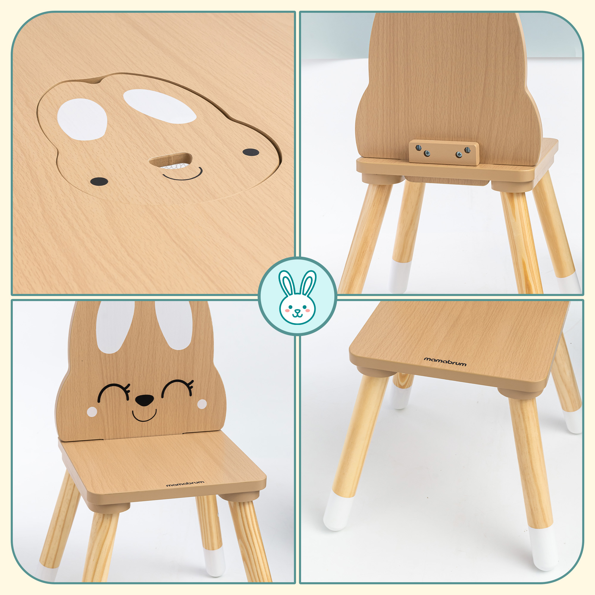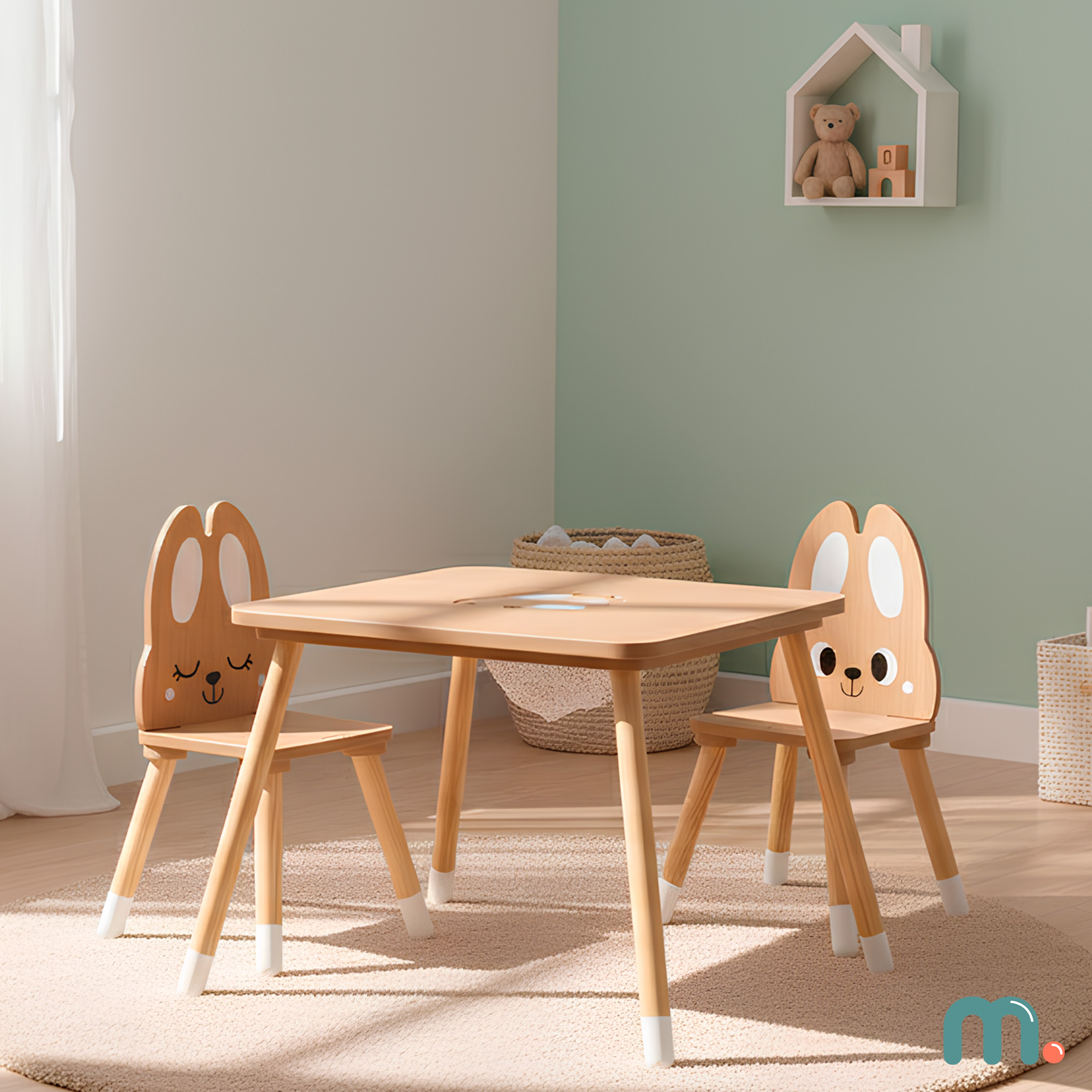 Mesa de madera con almacenaje y 2 sillas Conjunto infantil - Conejo Lindo