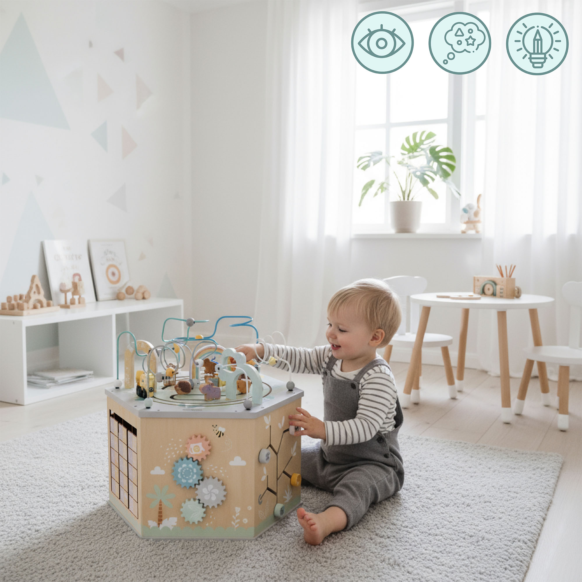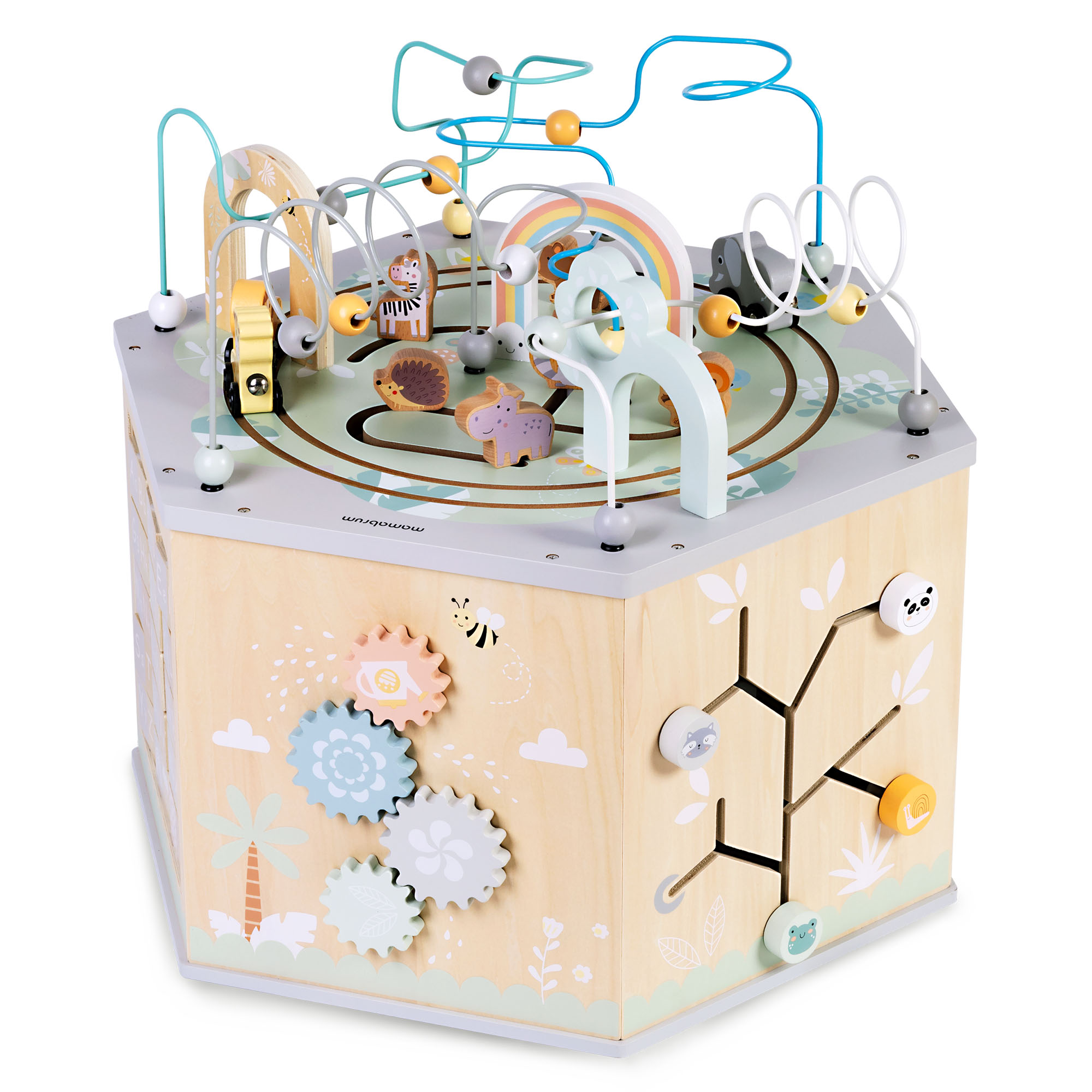 ¡Dale a tu hijo un juguete que le encantará con su diversidad y lo mantendrá entretenido durante horas! Este gran cubo educativo multifuncional es un verdadero centro de actividades que apoya el desarrollo de tu hijo a través del juego. Cada lado tiene una tarea diferente: desde mover cuentas hasta unir formas y girar engranajes. Sus colores suaves, adorables animales e ilustraciones simpáticas hacen del cubo no solo un juguete, sino también un elemento decorativo para la habitación infantil .