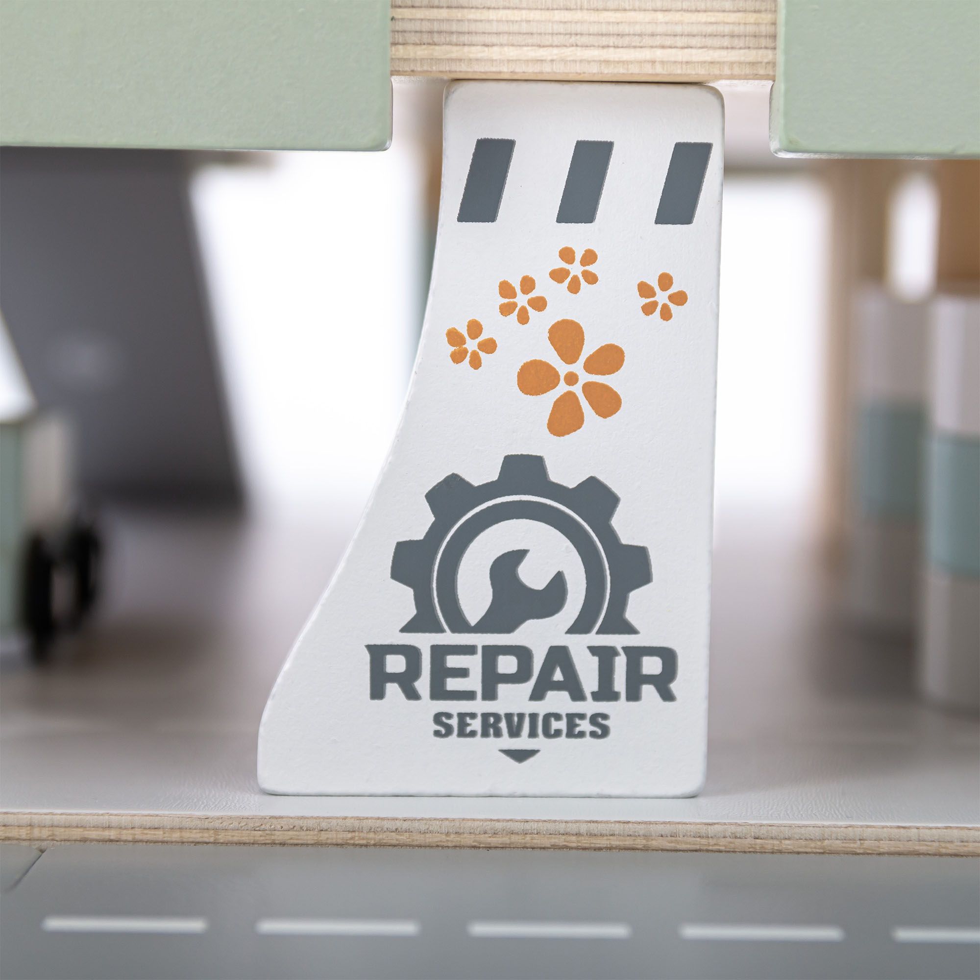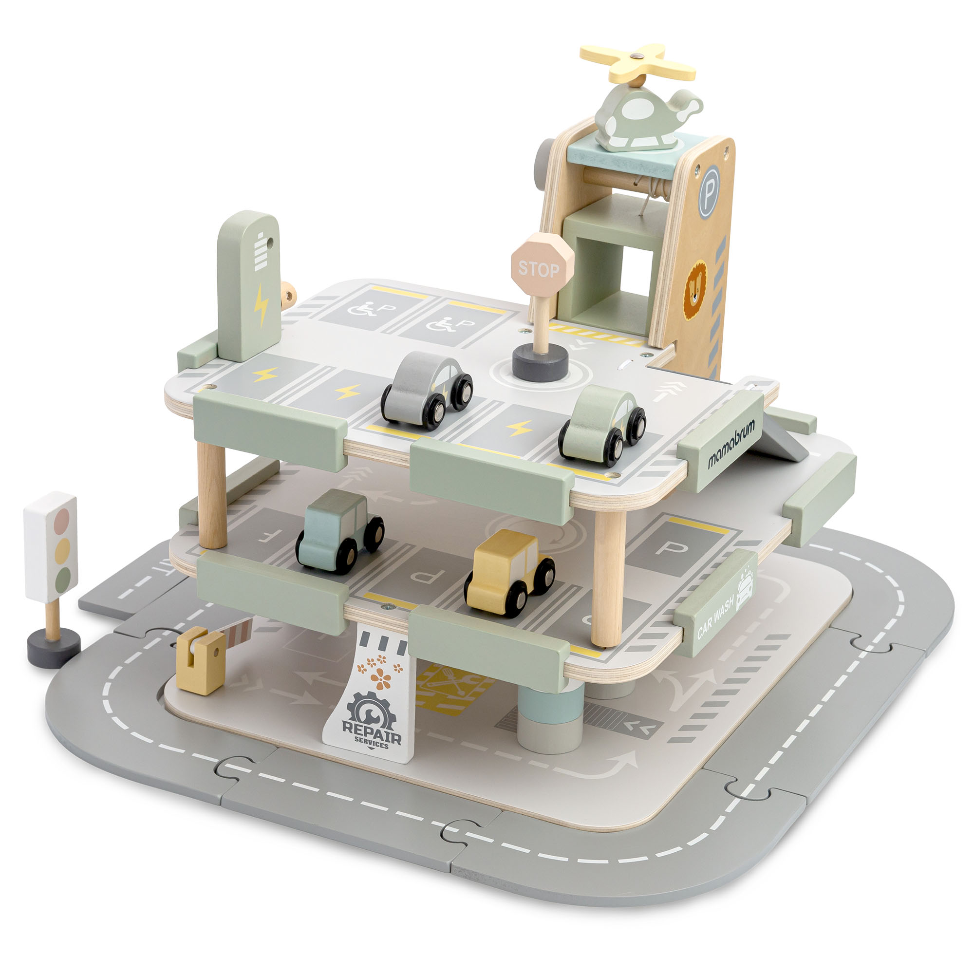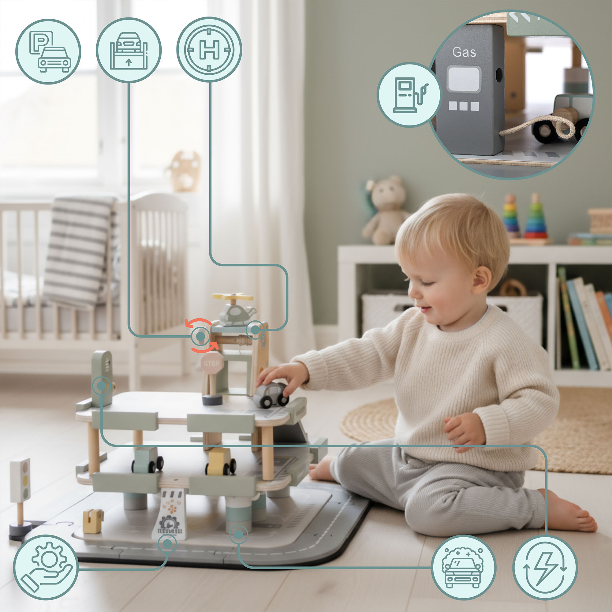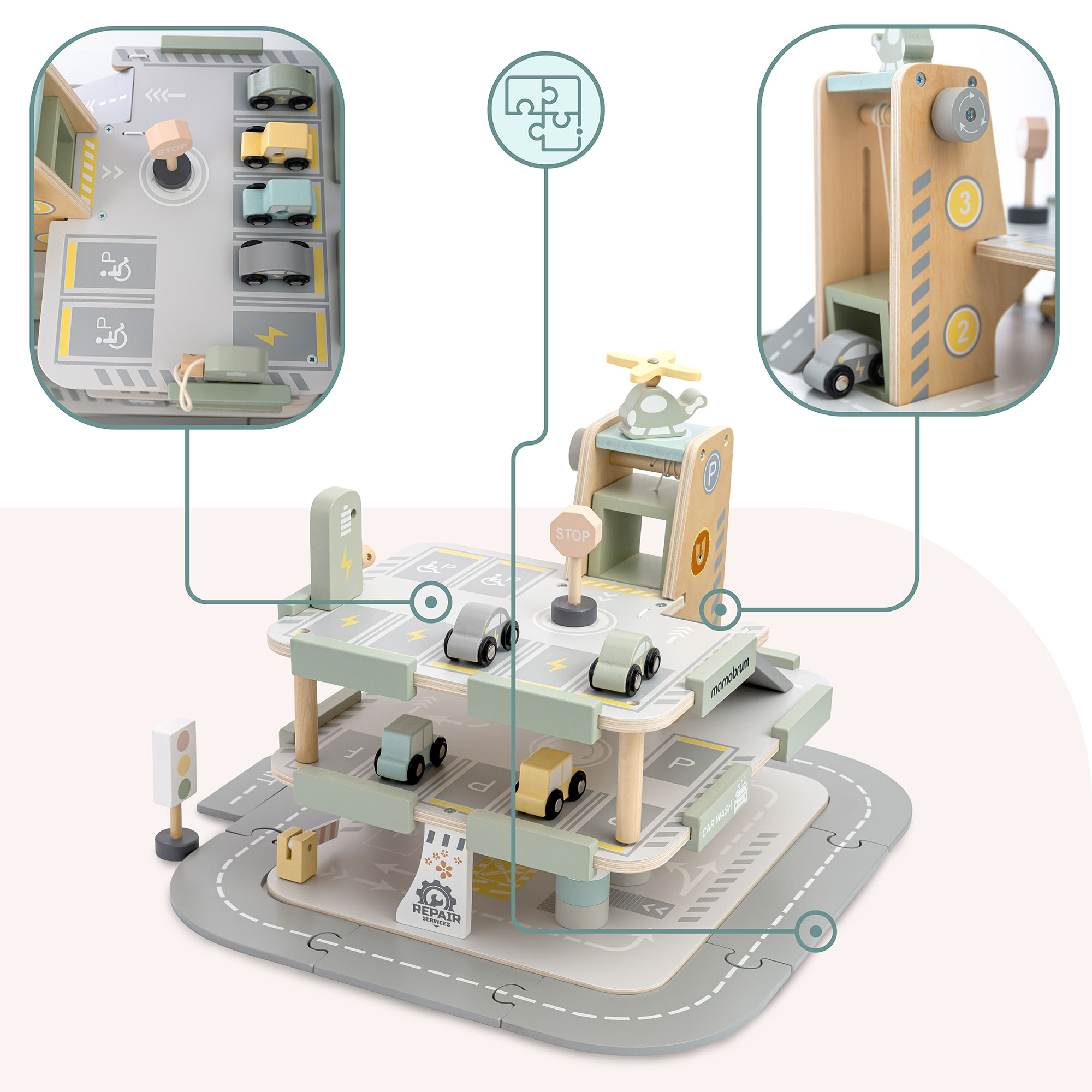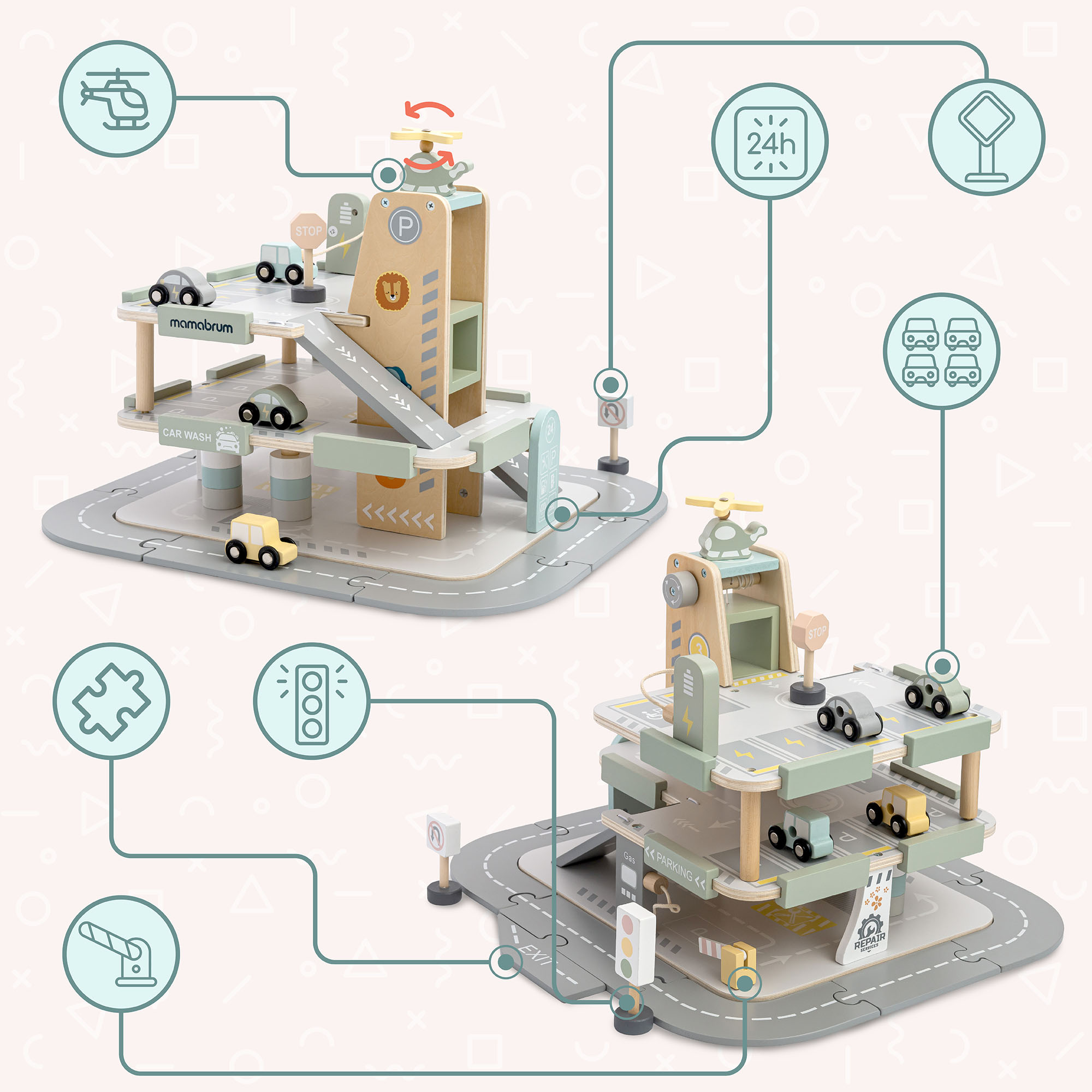 ¡Dale a tu pequeño su propio taller mecánico! El garaje Mamabrum de madera de tres pisos no es solo un estacionamiento , sino que también cuenta con gasolinera, lavadero de autos, taller mecánico, punto de carga eléctrica, elevador móvil para autos y helipuerto . Con una amplia gama de accesorios, los niños pueden crear innumerables escenarios de juego, desde viajes cotidianos hasta emocionantes aventuras urbanas.