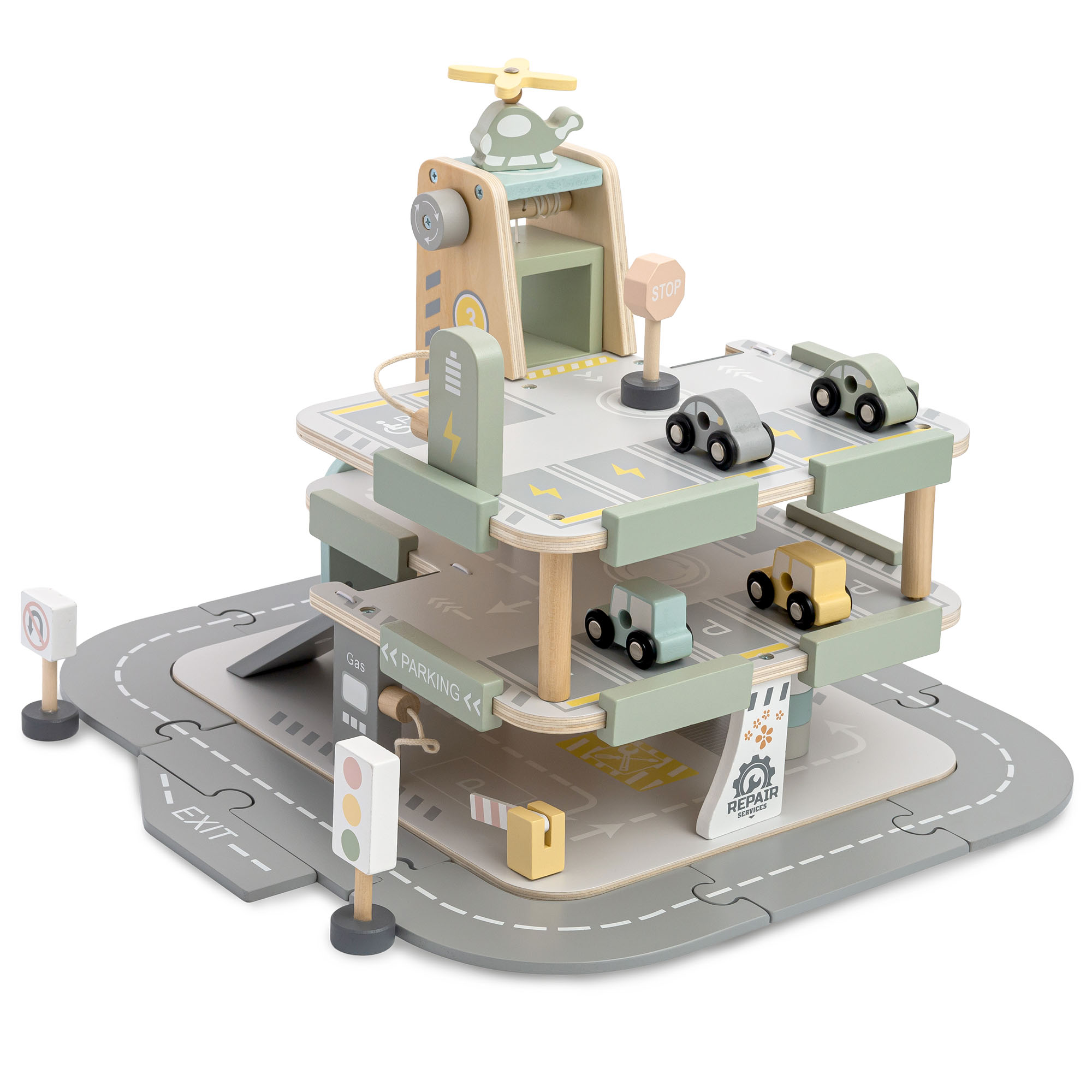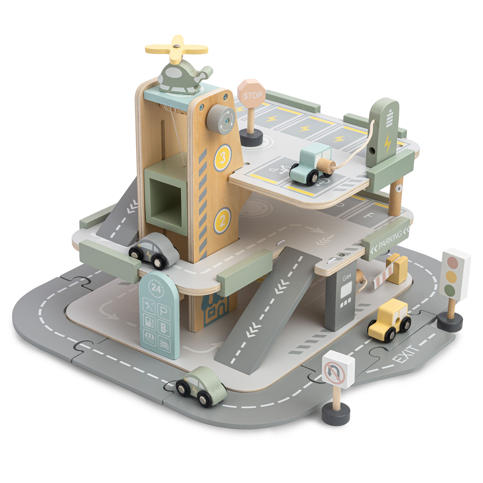 Garaje de madera de tres plantas para niños con accesorios: aparcamiento, gasolinera, lavadero de coches, helicóptero.