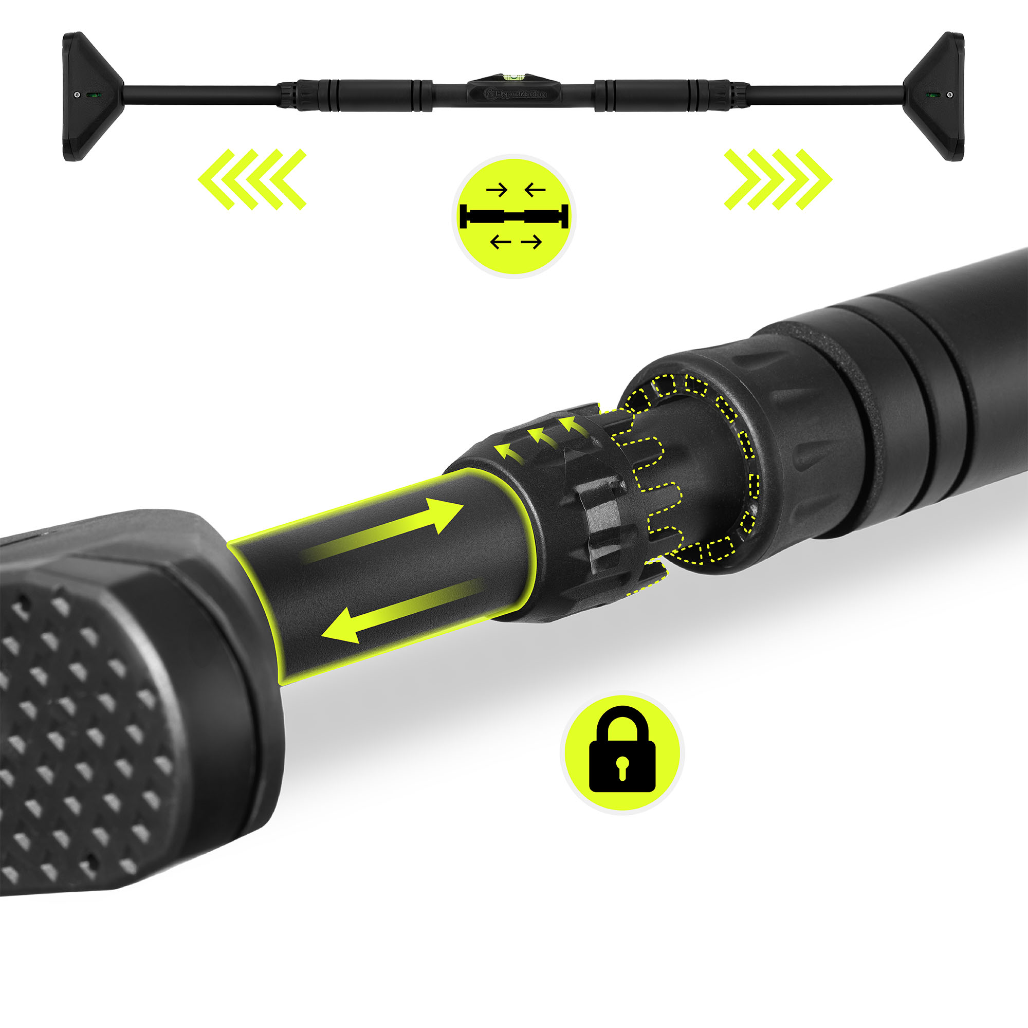 El sistema de montaje, basado en la fuerza de expansión, permite una instalación rápida, estable y no invasiva de la barra entre los marcos de las puertas , sin necesidad de taladrar agujeros ni herramientas adicionales. Las puntas de goma, fabricadas con el moderno material TPR (caucho termoplástico), protegen eficazmente la superficie del marco de la puerta contra daños y aumentan el agarre, garantizando una instalación segura durante el ejercicio. Un nivel de burbuja integrado facilita la correcta colocación de la barra, ayudando a mantenerla en su posición correcta durante el montaje. Gracias a su diseño intuitivo, la instalación se realiza en cuestión de segundos y una barra correctamente montada se mantiene estable y lista para el entrenamiento.
