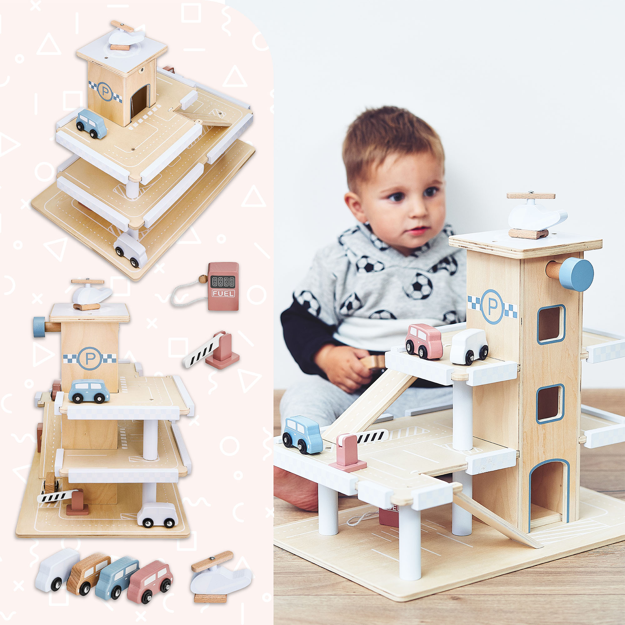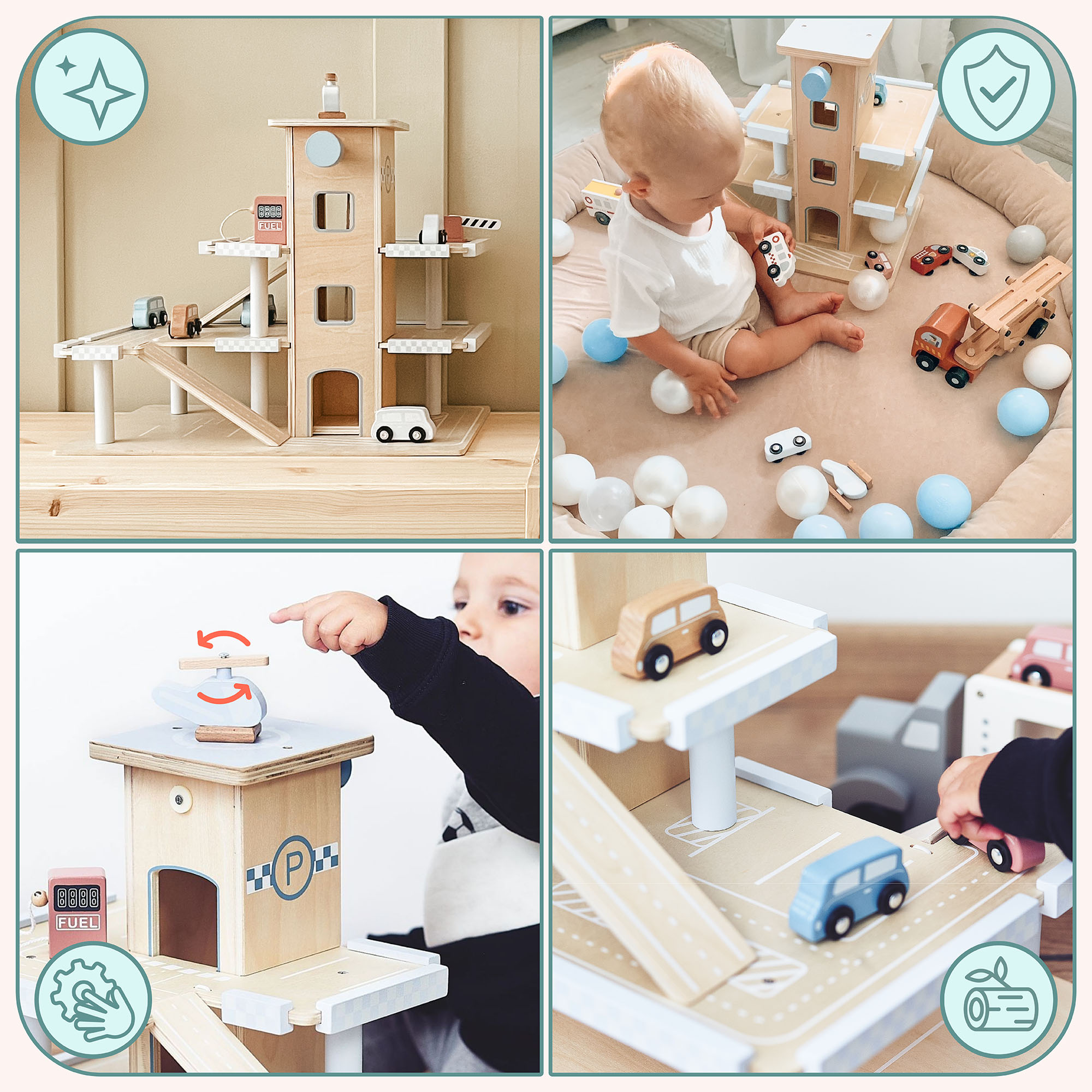 El garaje tiene tres niveles y tobogán. Por muy creativo que sea un niño, puede jugar con un juguete de madera. Mientras juega, el niño ejercita la coordinación ojo-mano. El juguete está hecho de contrachapado de alta calidad y los accesorios están pintados con tintes ecológicos.