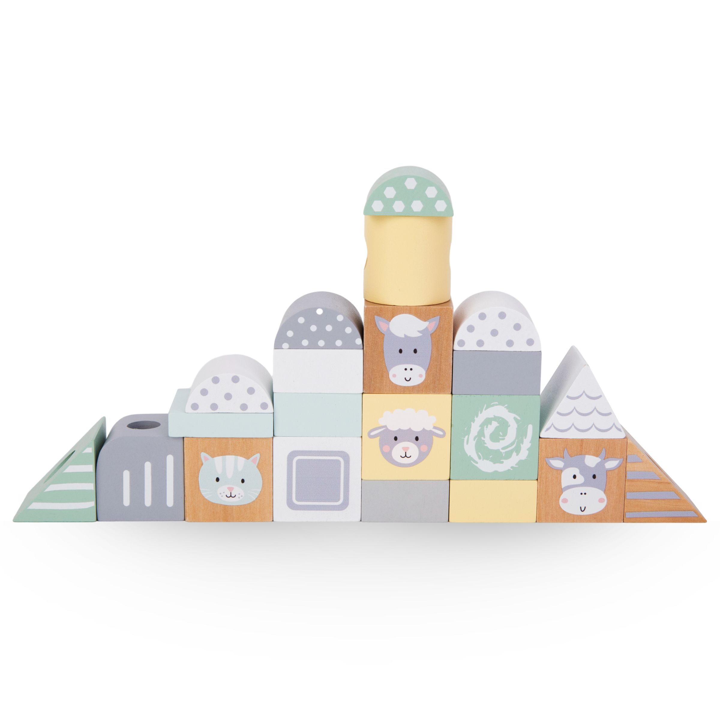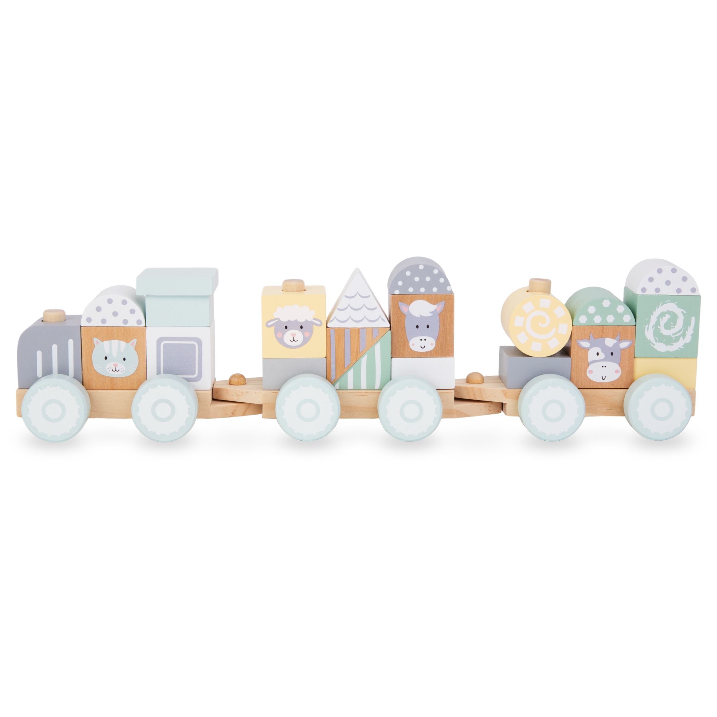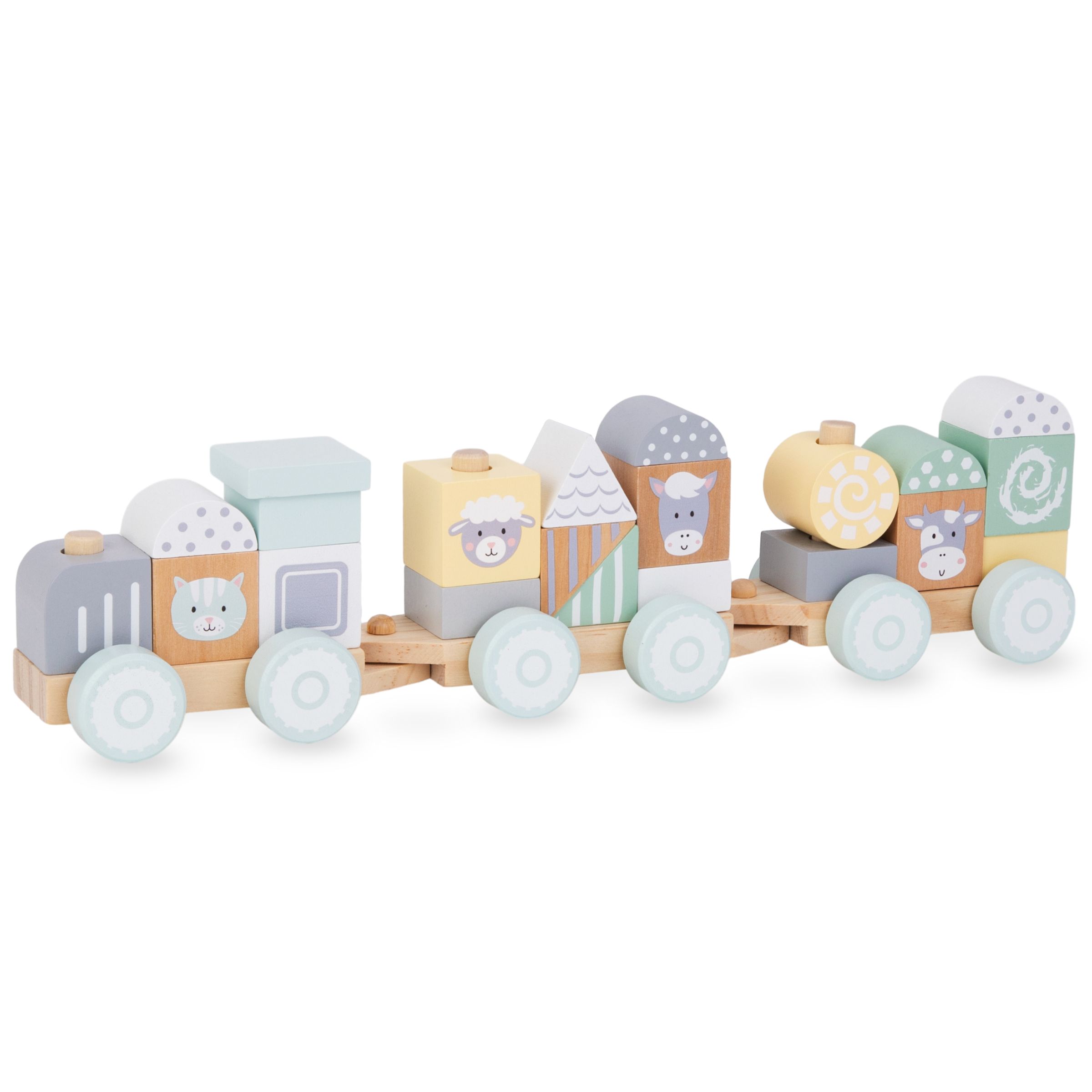Los vagones de madera con ruedas se pueden conectar entre sí para crear una locomotora única. Al colocar bloques de colores en clavijas especiales, el niño construye una estructura de tren única . ¡La cola puede verse diferente cada vez! Una vez que todo esté listo, llega el momento de salir a dar una vuelta. Durante el mismo, el niño podrá soltar los vagones o cambiar la posición de los bloques. Para diversificar la diversión, el set incluye bloques con imágenes de simpáticos animales : los habitantes de la granja.